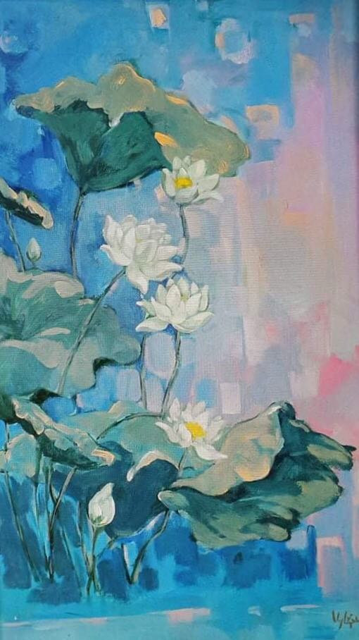 Còn họa sĩ Nguyễn Nghĩa Dậu với 2 bức tranh, "Sen hồng: Nhớ mùa sen năm ấy" và "Sen trắng: Một ngày mới", anh mong muốn người xem sẽ lĩnh hội được tinh thần an nhiên, thanh thản, nhẹ nhàng bước qua, dù cho cuộc sống đang gặp nhiều biến động do dịch bệnh Covid-19 gây ra.