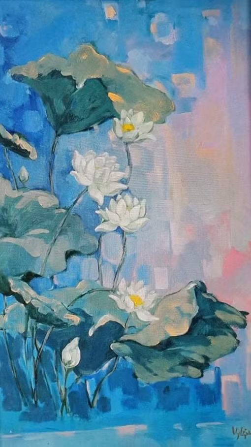 Nếu như bức sen trắng được anh vẽ trong cái nắng dịu nhẹ đón bình mình của một buổi sáng mùa hè với bút pháp mạnh mẽ, dứt khoát, thì bức sen hồng lại được họa sĩ vẽ dựa trên ký ức hồi tưởng về những mùa sen đã đi qua với những nét vẽ mềm mại, uyển chuyển.