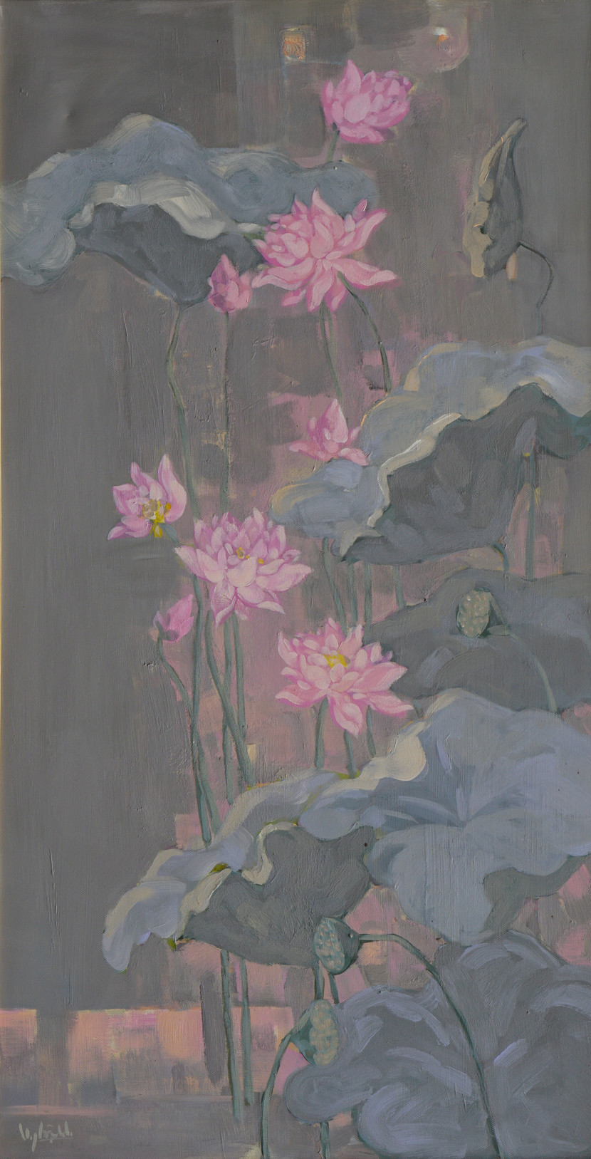 Tác phẩm "Sen hồng: Nhớ mùa sen năm ấy", chất liệu acrylic, kích thước 66x126 của họa sĩ Nguyễn Nghĩa Dậu