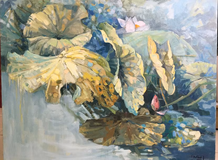 Là thành viên Ban Chủ nhiệm CLB Họa sĩ Sơn ta Việt Nam, nhưng Đỗ Đức Khải đã vẽ sen bằng chất liệu... sơn dầu. Anh vẽ trực họa tại mùa hè năm 2019 tại hồ sen Gia Lâm.