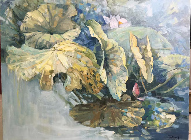 Tác phẩm "Hoa sen", chất liệu sơn dầu, kích thước 70x90 của họa sĩ Đỗ Khải sẽ góp mặt trong phiên đấu giá nghệ thuật