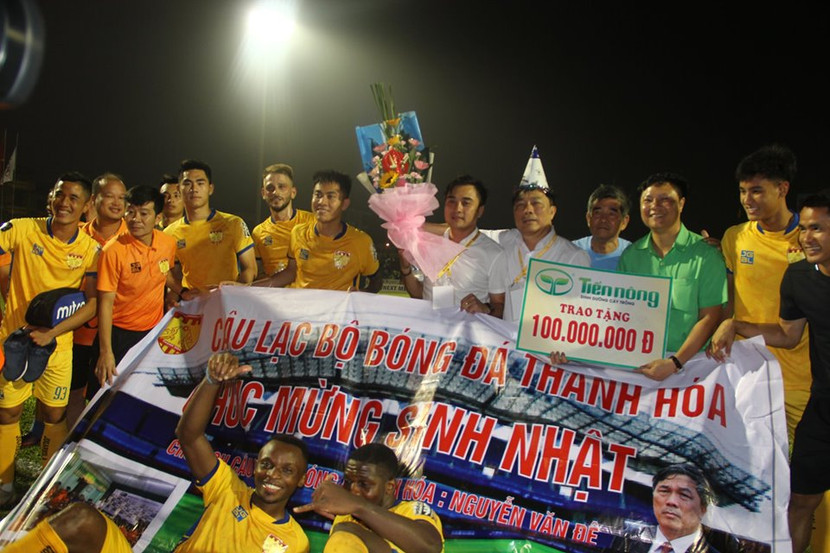 Sau chiến thắng Quảng Nam ở vòng 8 để thoát khỏi vị trí chót bảng, CLB Thanh Hóa nhận thưởng 500 triệu đồng. Và càng ý nghĩa hơn khi sau trận, bầu Đệ bất ngờ nhận được chiếc bánh sinh nhật cùng những lời chúc tốt đẹp từ cổ động viên đội bóng xứ Thanh ngay trên sân, trong ngày sinh nhật mình.