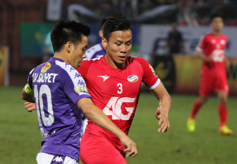 Mới đá cho Viettel hai trận song Quế Ngọc Hải (áo đỏ) đã vào bòng làm rạn xương sườn Dominik và chảy máu ống đồng Văn Kiên