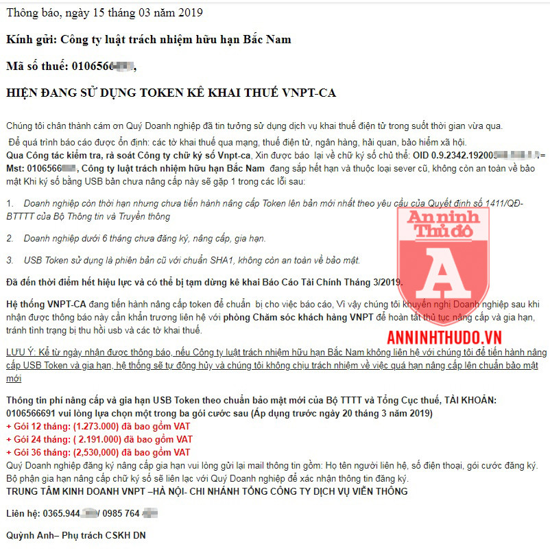 Theo thông báo trong email trên, nếu muốn xử lý thì khách hàng cần đóng phí để nâng cấp theo các gói cước được định sẵn (từ 1,2 triệu đồng tới 2,5 triệu đồng). Ký tên trong email này là "Quỳnh Anh - Phụ trách CSKH DN", kèm theo 2 số điện thoại liên lạc 0365.944.*** và 0985 764***.