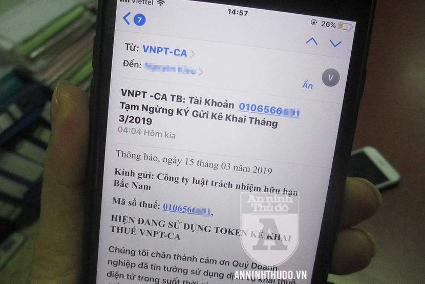 Sáng ngày 18-3-2019, Luật sư Nguyễn Thị Thúy Kiều - Giám đốc Công ty Luật TNHH Bắc Nam - nhận được email với tiêu đề "VNPT-CA TB: Tài Khoản 0106566*** Tạm Ngừng KÝ Gửi Kê Khai Tháng 3/2019".