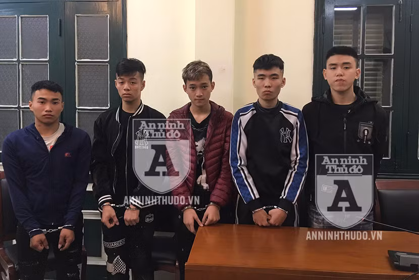 Nhóm 5 đối tượng bị bắt gồm: Đỗ Quốc Duy (SN 2002, trú tại phường Đồng Tâm, quận Hai Bà Trưng), Trần Nhật Anh (SN 2003, trú tại Vĩnh Hưng, Hoàng Mai), Hà Việt Khánh (SN 2001, trú tại phường Vĩnh Tuy, quận Hai Bà Trưng), Dương Bảo Anh (SN 2002, trú tại phố Dương Văn Bé, phường Vĩnh Tuy, quận Hai Bà Trưng), Trần Hoài Nam (SN 2003, trú tại phường Nhân Chính, quận Thanh Xuân).