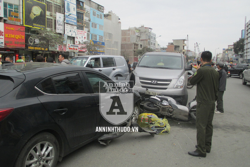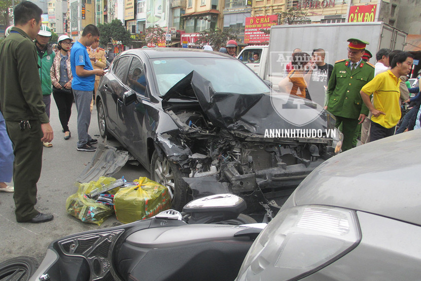 Cú đâm mạnh khiến cả 2 xe máy bị nhào về phía trước, va vào đầu 2 xe ô tô đi chiều ngược lại, khiến những người đi xe máy ngã lăn ra đường. Một cô gái trẻ đi chiếc xe máy SH Mode mang BKS 29G1-591.** may mắn ngã ra ngoài nên không bị chấn thương, trong khi hai người đi xe máy AirBlade mang BKS 26K6-8389 bị thương, được đưa đi cấp cứu.