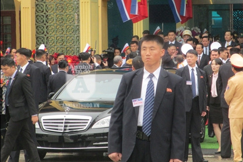 Tới khi Chủ tịch Triều Tiên Kim Jong-un chuẩn bị bước ra, chiếc xe ô tô đón ông lùi đuôi xe vào phía cửa (thay vì đỗ ngang như lệ thường). Các vệ sĩ lập tức tạo thành hàng rào vây kín xung quanh, và liên tục quan sát mọi hướng.