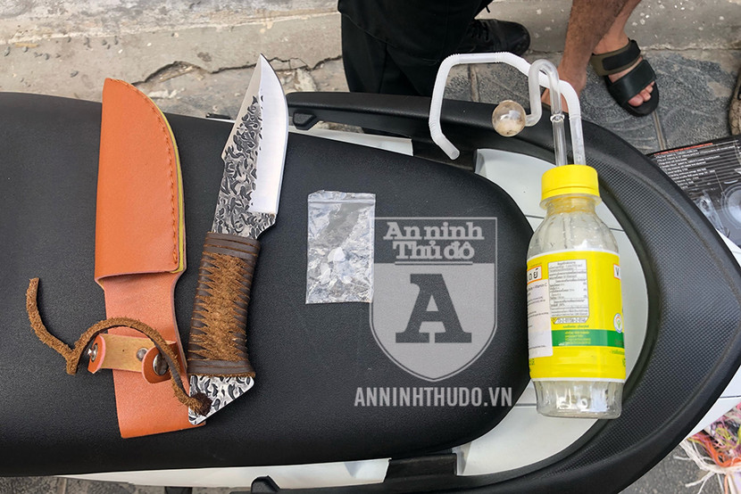 Trong quá trình kiểm tra tại chốt 141, cảnh sát phát hiện đối tượng cầm lái giấu 1 gói nilon chứa tinh thể màu trắng trong túi quần, nghi là ma túy. Người này cũng mang theo chiếc túi đựng bộ bình cóng (dùng để hút ma túy đá). Trong khi đó, đối tượng ngồi sau bị cảnh sát phát hiện giấu 1 con dao găm sắc nhọn, có bao đựng.