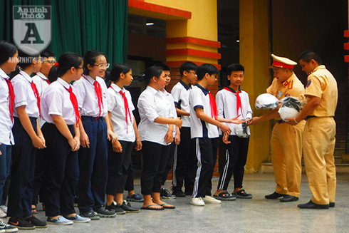 Cán bộ, chiến sĩ trao tặng mũ bảo hiểm cho các em học sinh