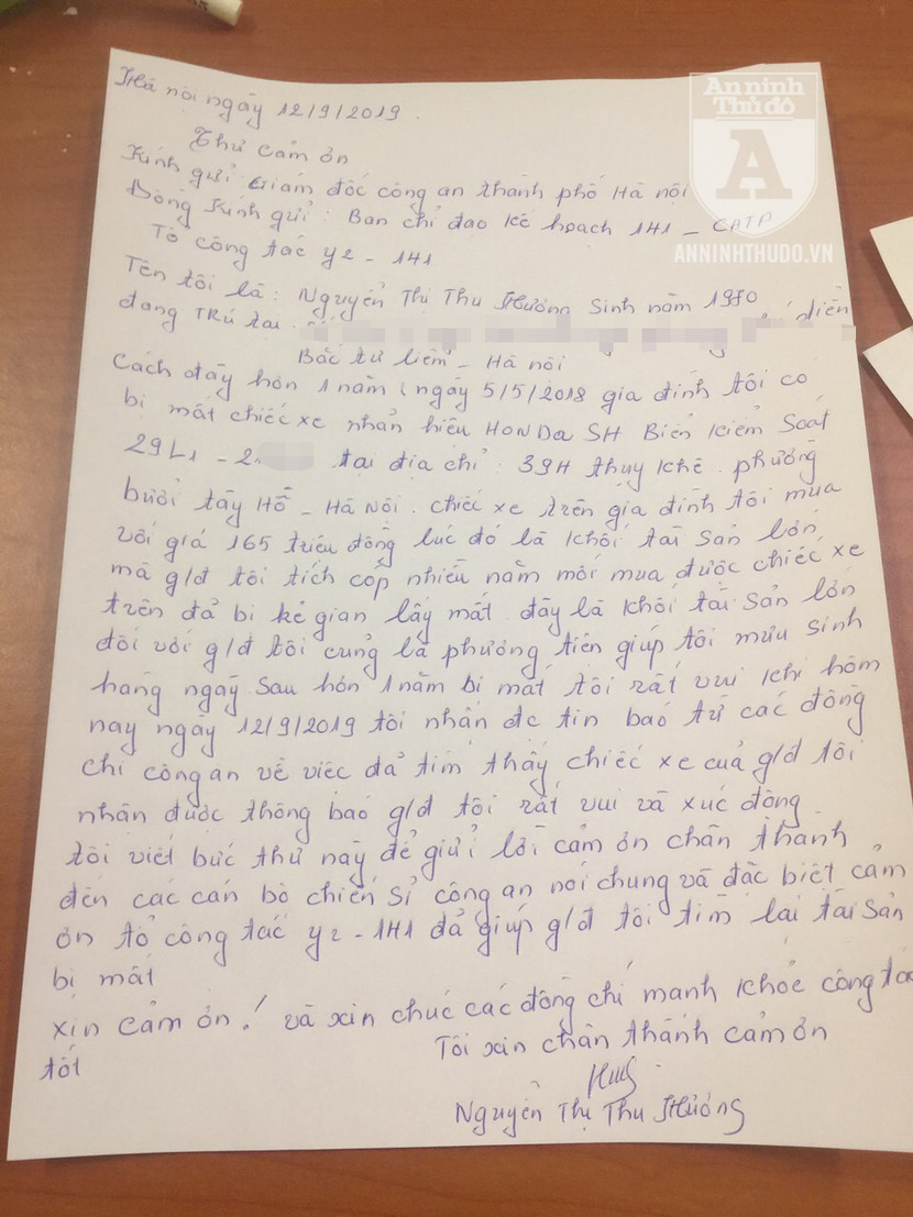 "Hơn một năm mất xe, tôi không nghĩ rằng sẽ có ngày mình được nhận lại xe. Tôi xin gửi lời cảm ơn chân thành nhất tới các cán bộ của tổ công tác Y2/141 đã nhiệt tình tra soát, liên lạc và hỗ trợ", chị Hương chia sẻ, sau khi viết lá thư cảm ơn dành cho lực lượng làm nhiệm vụ.