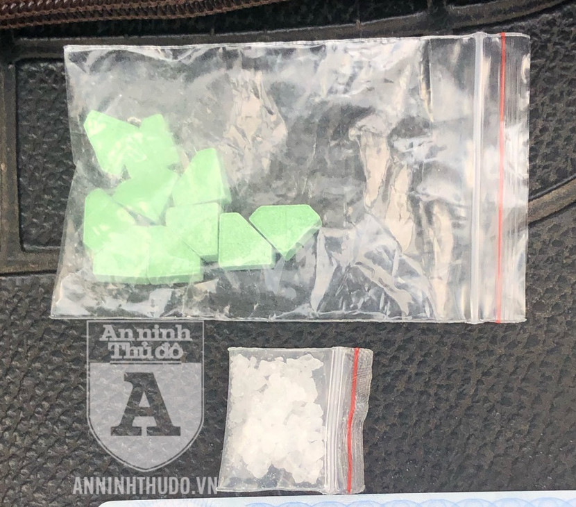Trong quá trình kiểm tra, cảnh sát phát hiện người đàn ông giấu 2 gói nilon, trong đó, 1 gói đựng 10 viên nén màu xanh lá cây, 1 gói đựng tinh thể màu trắng, tất cả nghi là ma túy.