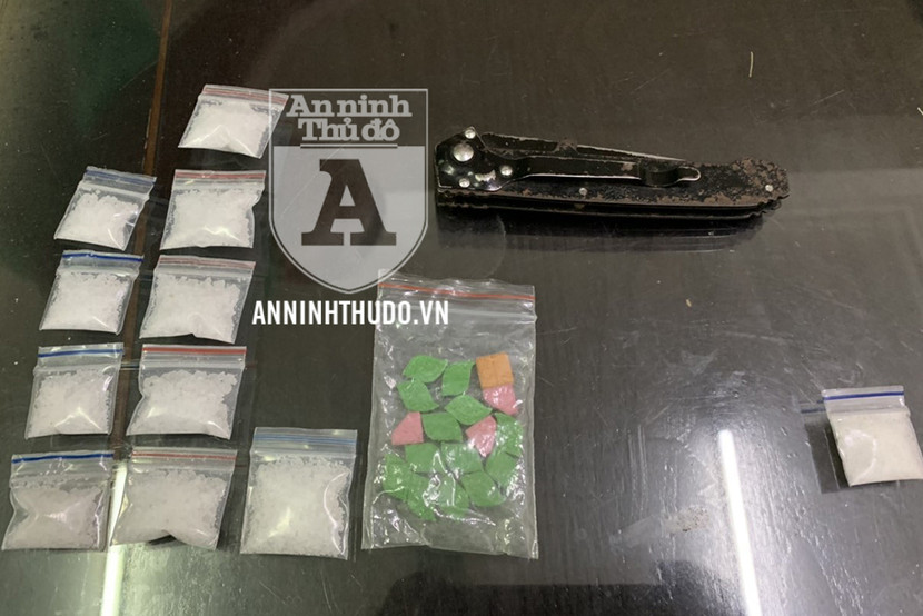 Trong quá trình kiểm tra, cảnh sát phát hiện "shipper" trên giấu trong lớp áo sâu nhất 11 gói nilon chứa tinh thể màu trắng, cùng 17 viên nén màu sắc khác nhau. Những gói nilon này được xác định là ma túy đá và ma túy tổng hợp. Ngoài ra, đối tượng này còn mang theo nhiều túi nilon nhỏ (túi chia), cùng dao gấp.