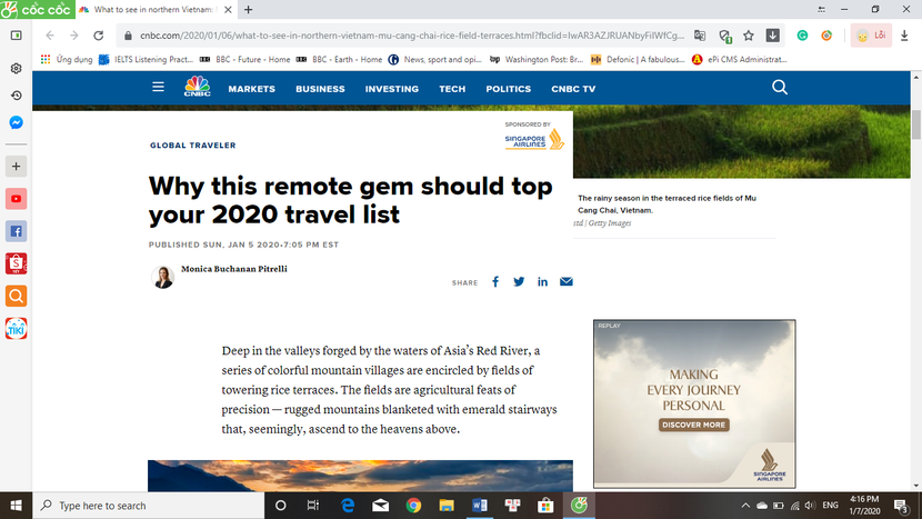 Theo bài viết, Mù Cang Chải của Yên Bái, điểm đến này nằm sâu trong những thung lũng được bồi đắp bởi sông Hồng, những bản làng trên núi rực rỡ được bao quanh bởi những ruộng bậc thang cao chót vót.