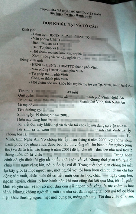 Lá đơn của chị T gửi cơ quan công an, tố cáo hành vi đồi bại của ông Đ