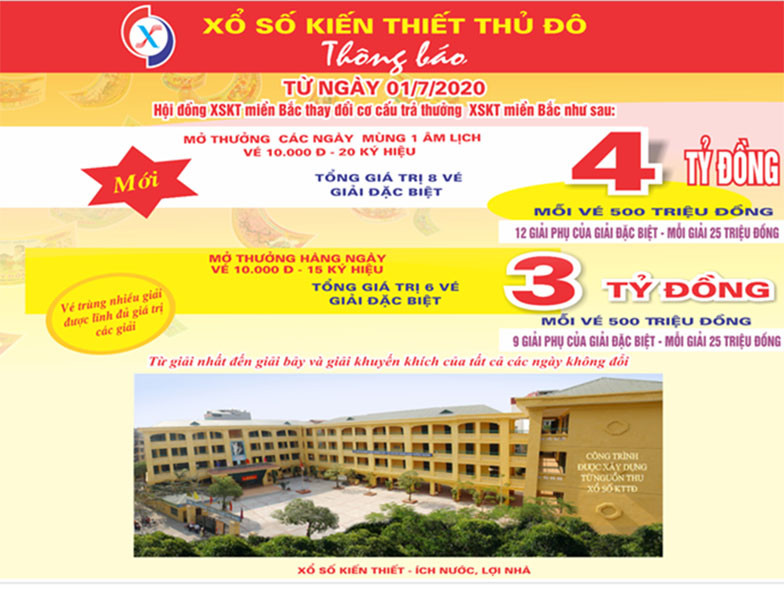 Kể từ ngày 1/7/2020. Vào các ngày mùng 1 âm lịch hàng tháng hội đồng XSKT miền Bắc phát hành loại vé 10.000đ – 20 loại: Tổng giá trị giải thưởng lên đến gần 10 tỷ đồng, trong đó 8 giải đặc biệt trị giá 4 tỷ đồng.