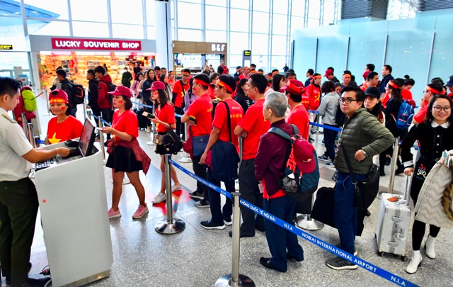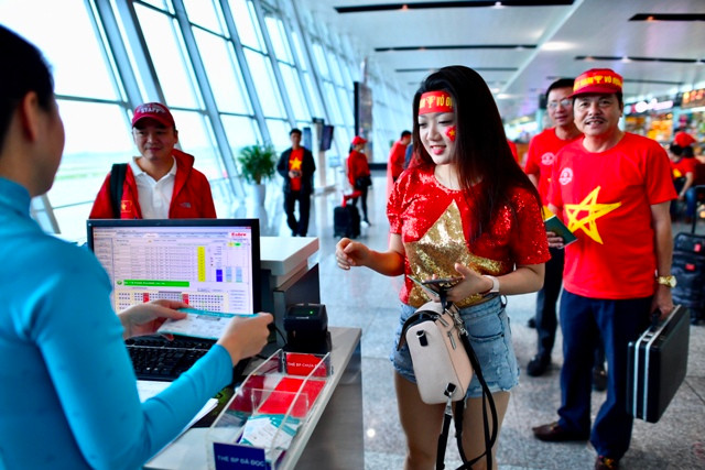 ANTD.VN - Sáng nay, 11-12, tại các sân bay lớn như Nội Bài, Tân Sơn Nhất và Đà Nẵng đã tràn ngập sắc đỏ của các cổ động viên Việt Nam làm thủ tục lên đường sang Malaysia để cổ vũ cho tuyển Việt Nam đá trận chung kết lượt đi tại đây.