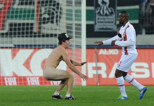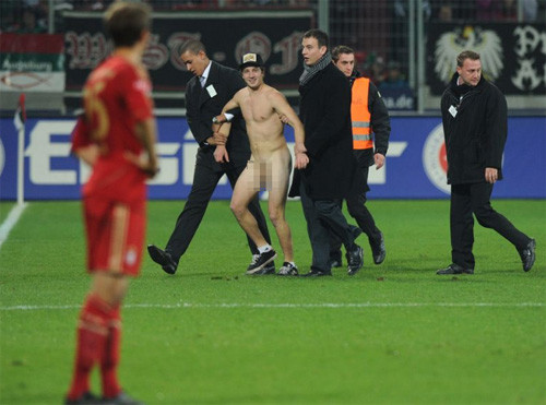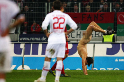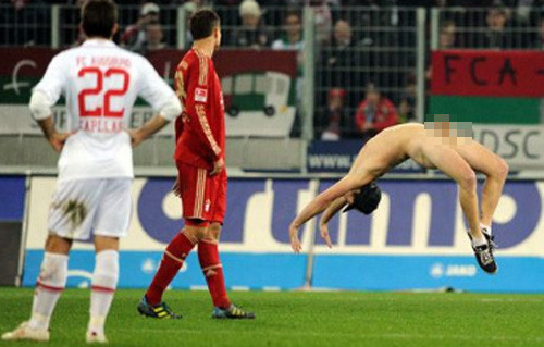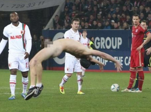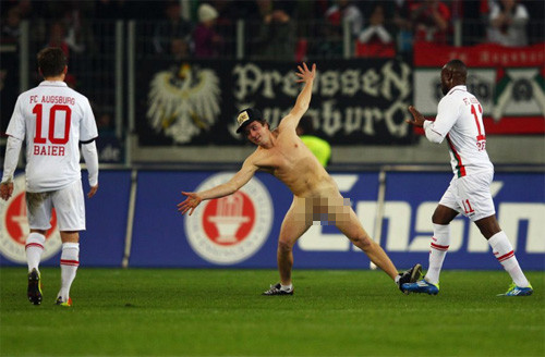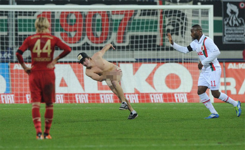 Trận đấu giữa Augsburg và Bayern Munich đã bị gián đoạn bởi một cổ động viện trần như nhộng chạy xuống sân nhảy nhót. Anh chàng lộn nhào và chạy vòng quanh trước con mắt của hàng trăm nghìn khán giả. Lâu lắm rồi, Bundesliga mới có cảnh hài hước như vậy.