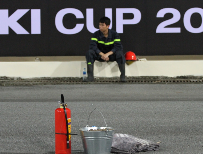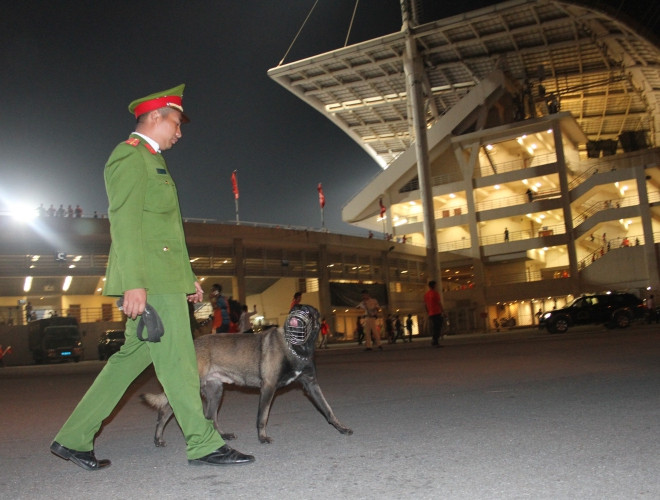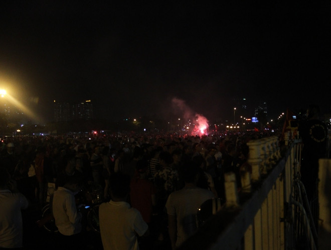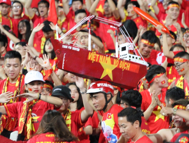 Cổ động viên tiếp lửa trên sân Mỹ Đình trong cuộc đấu với Malaysia