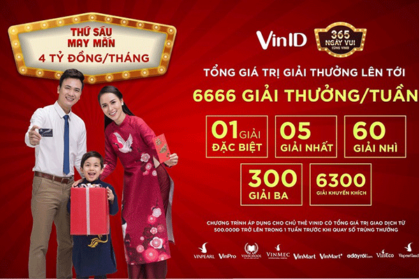 Ngoài ra, VinID còn dành 4 tỷ đồng cho các chương trình bốc thăm với hàng ngàn giải thưởng giá trị dành cho các chủ thẻ có phát sinh giao dịch mua sắm trong tuần với tổng hóa đơn trị giá từ 500.000 đồng/ tuần trở lên. Mã số tham gia dự thưởng chính là 16 số ghi trên thẻ VinID.