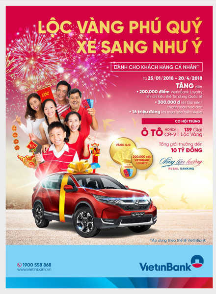 Nhằm mang đến niềm vui và may mắn cho quý khách hàng nhân dịp đón Xuân Mậu Tuất 2018, từ ngày 25/1/2018 đến ngày 20/4/2018, VietinBank triển khai chương trình khuyến mãi (CTKM) “Lộc vàng phú quý - Xe sang như ý” với tổng giá trị giải thưởng lên đến 10 tỷ đồng.
