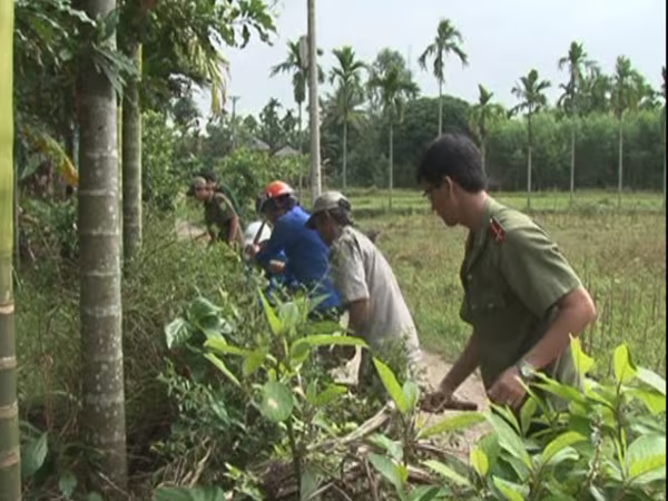 Lực lượng Công an và thanh niên phát quang bụi rậm tại xã Hành Trung.