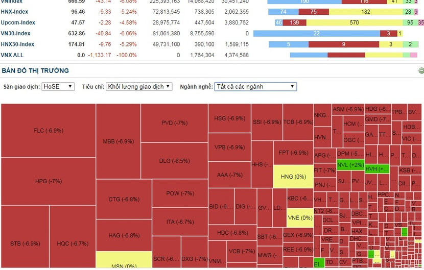 Đóng cửa phiên giao dịch, chỉ số VN-Index giảm 43,14 điểm (6,08%) xuống 666,59 điểm; HNX-Index giảm 5,44% xuống 96,26 điểm và UPCoM-Index giảm 4,55% xuống 47,58 điểm. Giá trị khớp lệnh trên toàn thị trường chỉ đạt xấp xỉ 4.000 tỷ đồng.