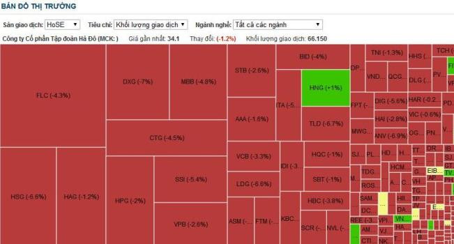 Diễn biến không hề được cải thiện về cuối phiên sáng, kéo các chỉ số lao dốc thảm hại, đặc biệt tập trung vào các mã vốn hóa lớn. DXG giảm sàn, FLC mất 4,3%, SHG giảm 6,6%, SSI giảm 5,4%, CTG giảm 4,5%, MBB giảm 4,8%.