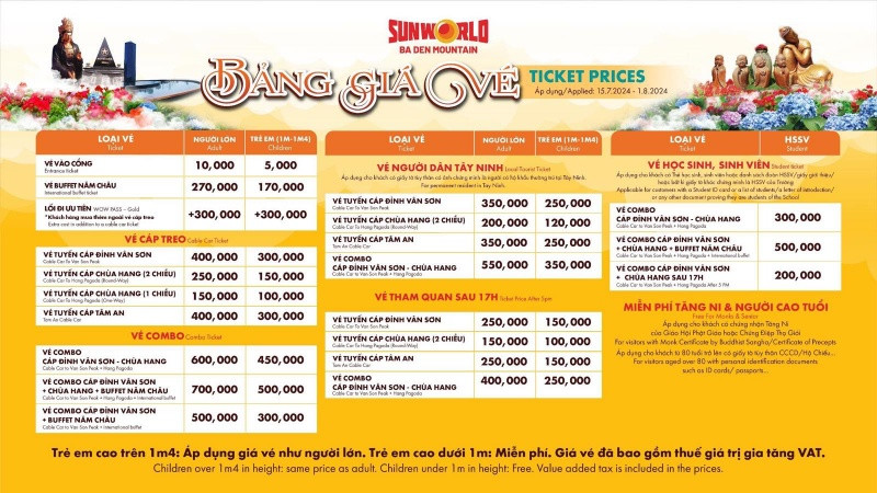 Ưu đãi áp dụng từ ngày 15/7-1/8/2024. Theo đó, bên cạnh combo vé cáp treo lên Chùa và đỉnh núi ưu đãi 50% với mức giá chỉ còn 300.000 đồng, Khu du lịch Sun World Ba Den Mountain còn áp dụng combo vé cáp Chùa + đỉnh + ăn buffet tại nhà hàng Năm Châu chỉ còn 500.000 đồng. Chương trình áp dụng cho khách hàng có thẻ học sinh, sinh viên hoặc đi theo danh sách đoàn HSSV, hay có bất kỳ giấy tờ khác chứng minh đang là HSSV tại các trường trên cả nước.