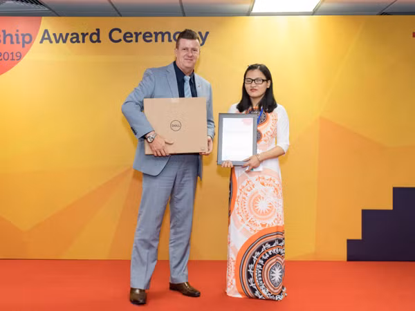 Nghiêm Thu Loan nhận học bổng RMIT toàn phần Chắp cánh ước mơ và chiếc máy tính xách tay do Phó hiệu trưởng phụ trách Đào tạo RMIT Việt Nam, Giáo sư Rick Bennett trao tặng