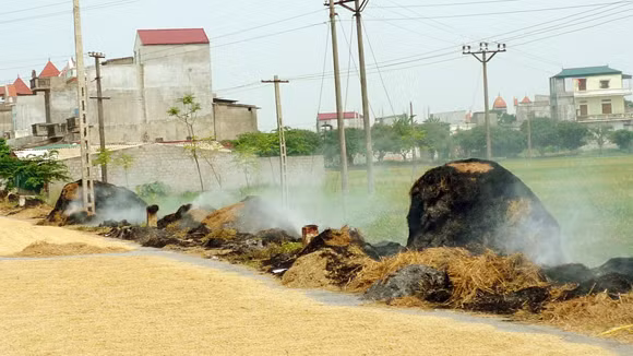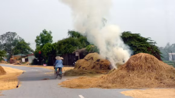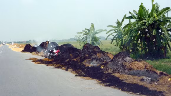 Trên đường tỉnh lộ thuộc địa bàn huyện Ứng Hòa đoạn đi qua xã Hoa Sơn nối từ ngã ba Miếu Môn rẽ về Cầu Lão, người dân phơi rơm, lúa, đốt rơm, rạ, rất nguy hiểm cho người tham gia giao thông.