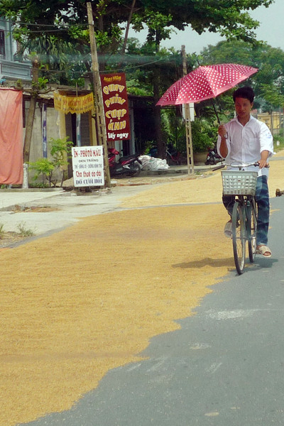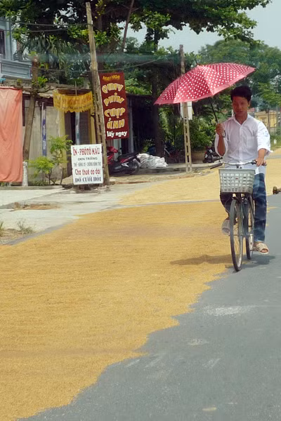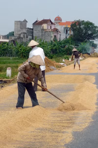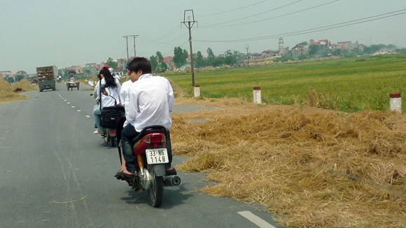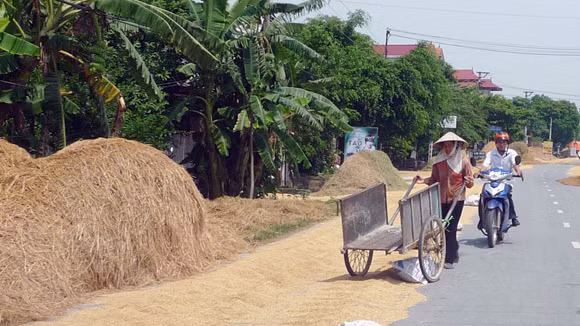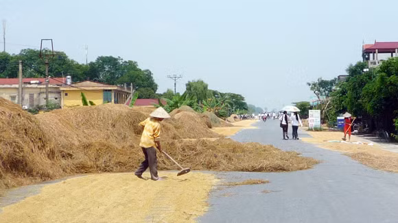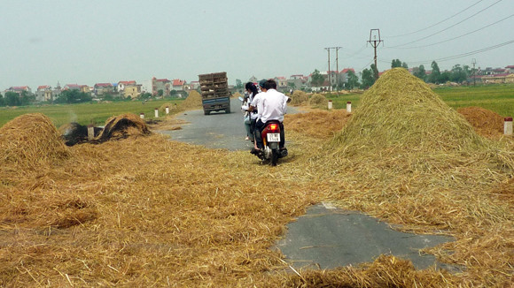 Con đường có chiều rộng hơn 8m thì 3/4 lòng đường là nơi phơi rơm. rạ các phương tiện đi qua đây rất dễ xảy ra tai nạn.
