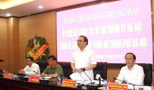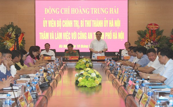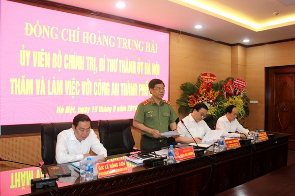 Phát biểu tại buổi làm việc, thay mặt lãnh đạo và nhân dân TP Hà Nội, đồng chí Bí thư Thành ủy Hoàng Trung Hải bày tỏ niềm vui khi về thăm, làm việc và chúc mừng Đảng ủy, Ban Giám đốc, các thế hệ cán bộ Công an lão thành cũng như CBCS - CATP Hà Nội nhân dịp kỷ niệm Ngày truyền thống 19-8.