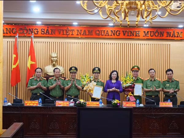Đồng chí Ngô Thị Thanh Hằng, Ủy viên Trung ương Đảng, Phó Bí thư thường trực Thành ủy Hà Nội tặng hoa chúc mừng hai đồng chí Phó Giám đốc CATP