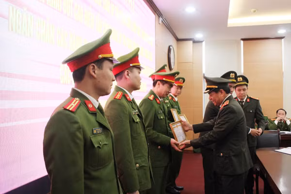Trung tướng Đoàn Duy Khương, Ủy viên Ban Thường vụ Thành ủy, Bí thư Đảng ủy, Giám đốc Công an thành phố Hà Nội tặng Giấy khen cho các tập thể có thành tích xuất sắc trong thực hiện cao điểm