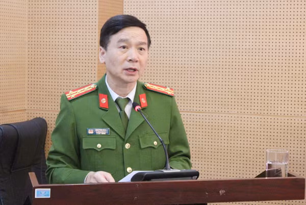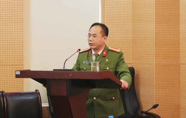Đại tá Nguyễn Bình, Trưởng phòng CSHS - CATP Hà Nội trình bày báo cáo tổng kết cao điểm đấu tranh phòng chống tội phạm cướp, cướp giật tài sản, trộm cắp tài sản