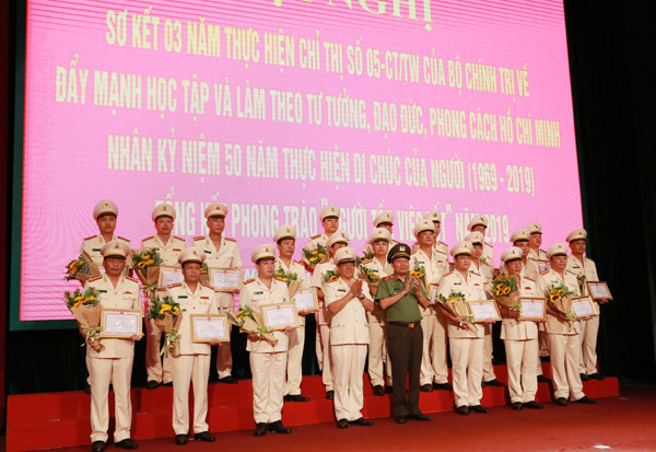 Trung tướng Đoàn Duy Khương và Thiếu tướng Đào Gia Bảo tặng hoa và giấy khen của Giám đốc CATP cho 25 gương điển hình tiên tiến trong học tập và làm theo tư tưởng đạo đức Hồ Chí Minh