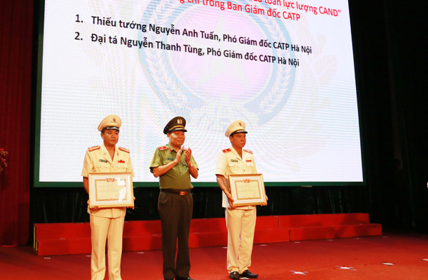 Thiếu tướng Đào Gia Bảo, Cục trưởng Cục Công tác Đảng và công tác chính trị- Bộ Công an tặng danh hiệu Chiến sỹ thi đua toàn lực lượng cho hai đồng chí Phó Giám đốc CATP: Thiếu tướng Nguyễn Anh Tuấn và Đại tá Nguyễn Thanh Tùng
