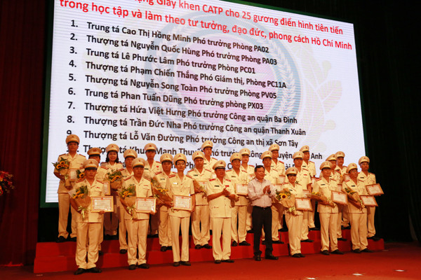 Thiếu tướng Đào Thanh Hải, Phó Bí thư Đảng ủy, Phó Giám đốc CATP và ông Nguyễn Văn Phong, Ủy viên Ban thường vụ Thành ủy, Trưởng ban Tuyên giáo Thành ủy Hà Nội tặng hoa và giấy khen của Giám đốc CATP cho 25 gương điển hình tiên tiến trong học tập và làm theo tư tưởng đạo đức Hồ Chí Minh