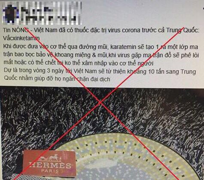 Ngày 8-2, Công an thị xã Sơn Tây, Hà Nội đã triệu tập N.X.Đ (trú tại phường Trung Sơn Trầm, thị xã Sơn Tây) để làm rõ việc đăng tải thông tin sai sự thật trên mạng xã hội về thuốc đặc trị virus Corona. Trước đó, qua công tác nắm tình hình, Công an thị xã Sơn Tây phát hiện tài khoản facebook cá nhân của N.Đ đăng tải nội dung: “Tin nóng: Việt Nam đã có thuốc đặc trị virus corona trước cả Trung Quốc: Vắc xin ketamin. Khi được đưa vào cơ thể qua đường mũi, karatemin sẽ tạo ra một lớp ma trận bao bọc bảo vệ khoang miệng và mũi… Dự là trong vòng 3 ngày tới Việt Nam sẽ từ thiện khoảng 10 tấn sang Trung Quốc, nhằm giúp đỡ họ ngăn chặn đại dịch”.