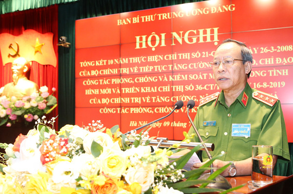 Thượng tướng Lê Quý Vương, Ủy viên Trung ương Đảng, Thứ trưởng Bộ Công an trình bày báo cáo tóm tắt Tổng kết 10 năm thực hiện Chỉ thị số 21-CT/TW của Bộ Chính trị về “Tiếp tục tăng cường lãnh đạo, chỉ đạo công tác phòng, chống và kiểm soát ma túy trong tình hình mới”