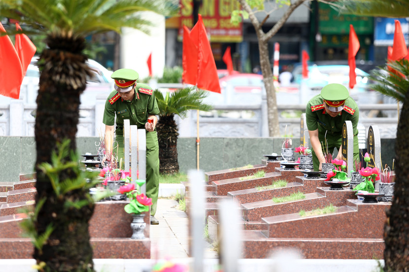 | Cán bộ, chiến sĩ Công an phường Hà Đông dâng vòng hoa tại Nghĩa trang liệt sĩ Quang Trung |