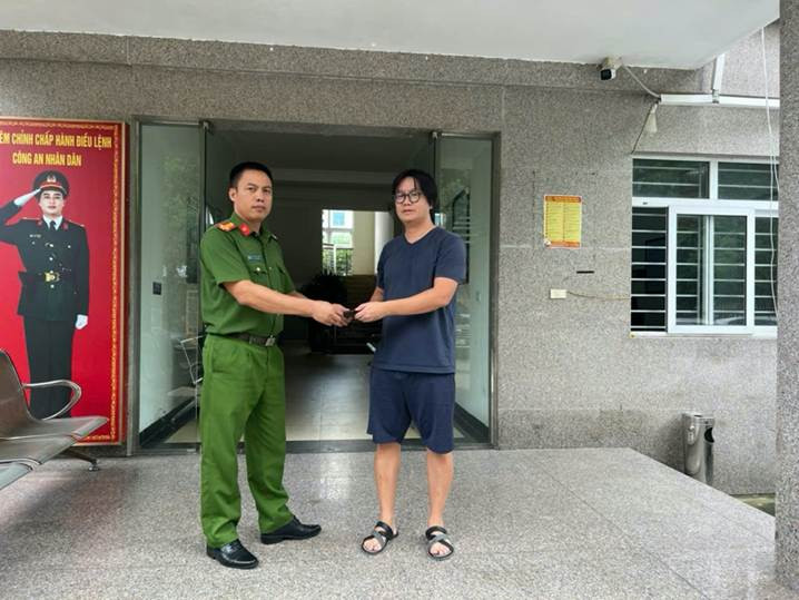 | Cán bộ Công an phường Việt Hưng trao trả cho công dân toàn bộ giấy tờ, tiền mặt bị làm rơi |