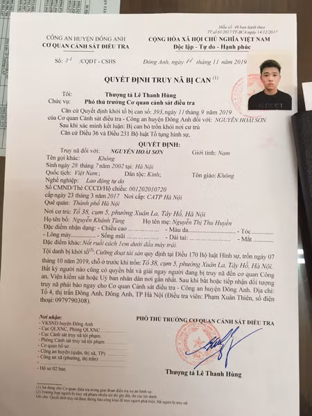 Quyết định truy nã đối tượng Nguyễn Hoài Sơn của CAH Đông Anh