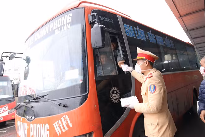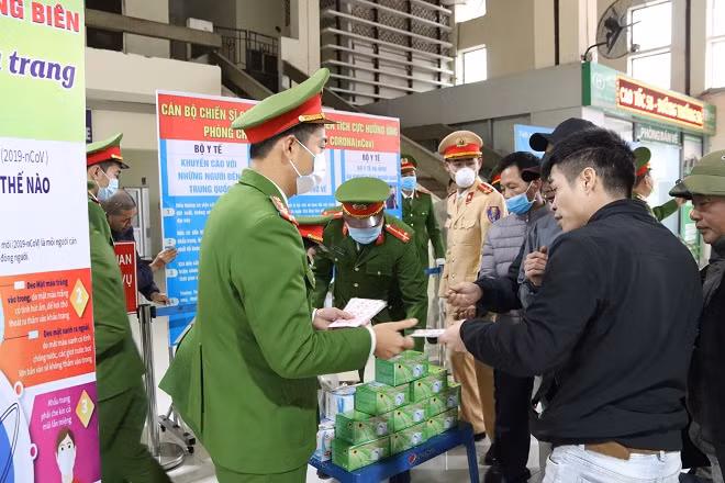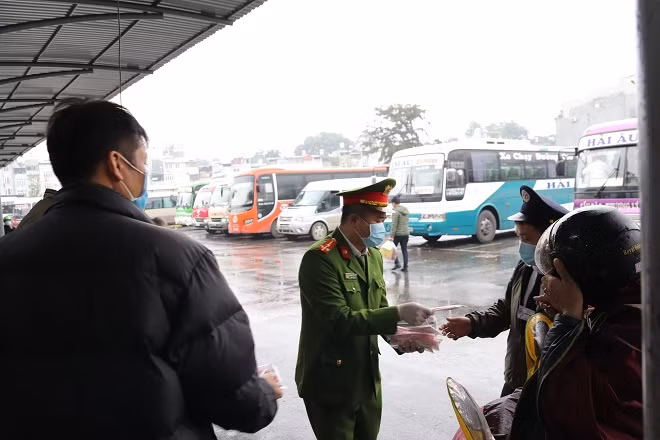 Các chiến sỹ phát khẩu trang cho người dân trên các chuyến xe khách