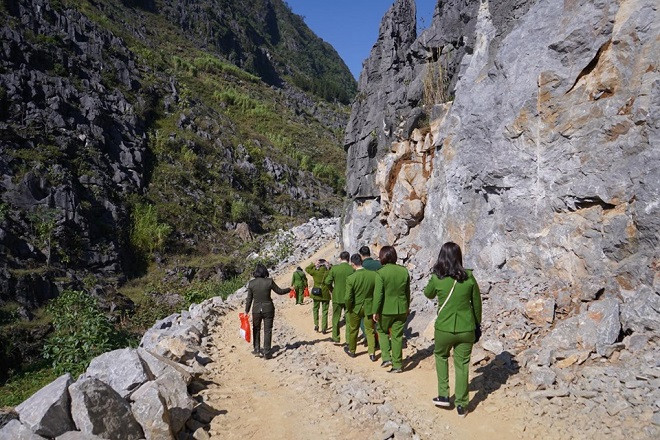 Trong chặng hành trình đến được với điểm trường mầm non xã Lũng Táo gần 500km ấy, cán bộ chiến sỹ Công an Thủ đô đã phải đi bộ vượt qua hơn 5km đường sỏi đá, để mang quà đến với các em nhỏ.