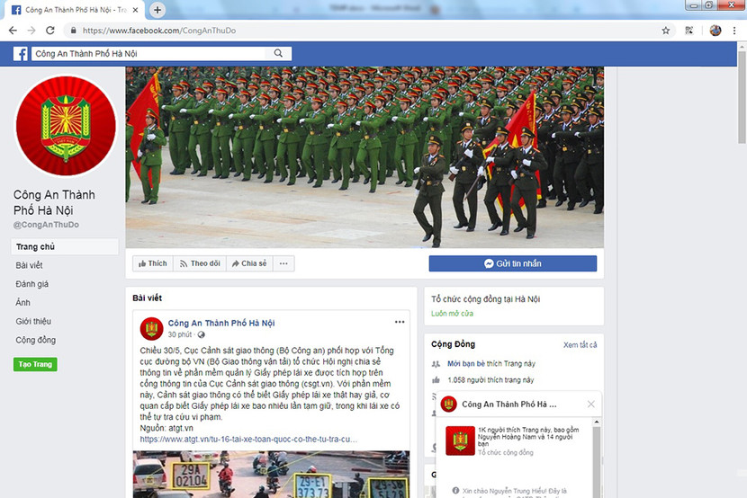 Fanpage chính thức của CATP Hà Nội có địa chỉ www.facebook.com/CongAnThuDo