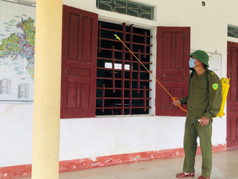 Công an xã Cẩm Duệ phun diệt trùng tại trường học