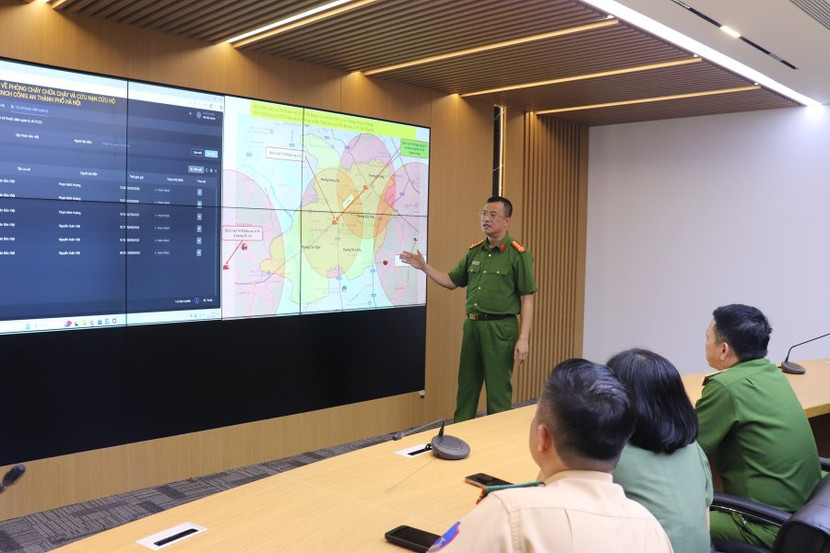 Đại tá Phạm Trung Hiếu, Trưởng phòng Cảnh sát PCCC&CNCH, CATP báo cáo các thông tin về Trung tâm Thông tin chỉ huy của Phòng Cảnh sát PCCC&CNCH
