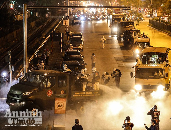Lực lượng chức năng phun khử khuẩn khu vực bệnh viện Bạch Mai